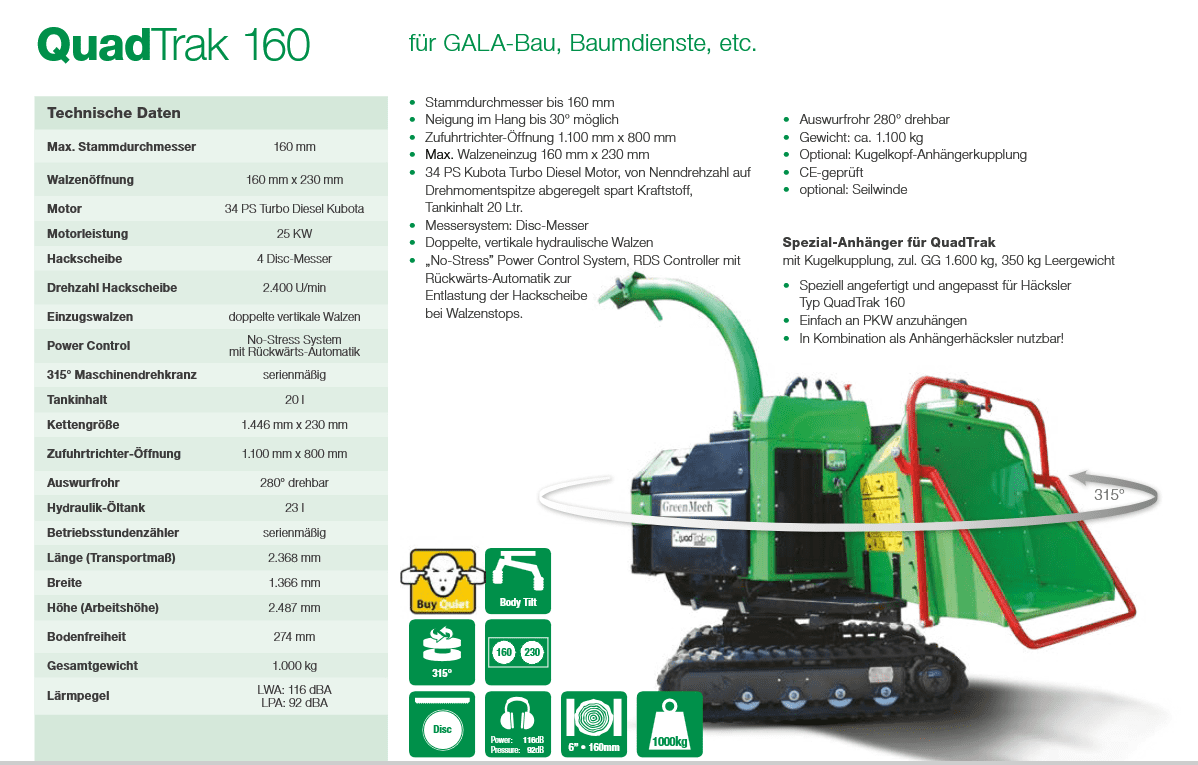 Mit dem Quad Trak 160 Kettenhäcksler erhalten Sie ein leistungsstarkes, mobiles Werkzeug, das Ihnen hilft, auch unter extremen Bedingungen effizient zu arbeiten – ideal für Profis, die auf Zuverlässigkeit und Flexibilität angewiesen sind.